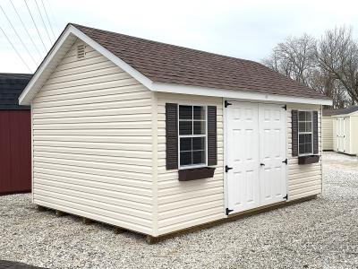 Pearl vinyl siding with White trim, Brown shutters and Burn Sienna architectural shingles are featured on this 12x16 Chalet.