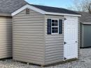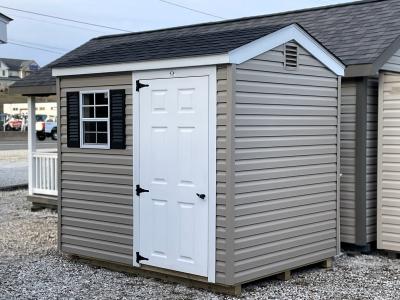 This 6x8 Cottage has Clay vinyl siding with White trim, Black shutters, and Charcoal Black architectural shingles.