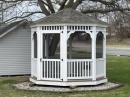 | This White vinyl 10-foot Octagon Gazebo has Weatheredwood Vinyl Decking and Weatheredwood Architectu... |