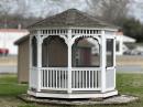 This White vinyl 10-foot Octagon Gazebo has Weatheredwood Vinyl Decking and Weatheredwood Architectural Shingles.