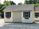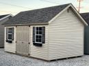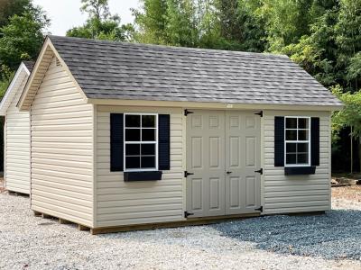 This 10x16 Chalet has Tan vinyl siding with Black shutters & flower boxes, and Weatheredwood architectural shingles.