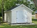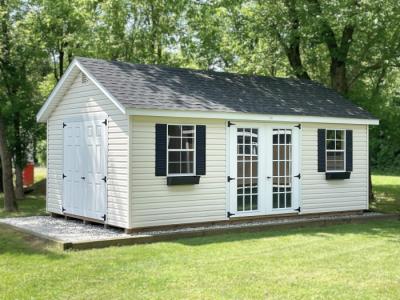 This 12x20 Chalet has Pearl vinyl siding with White trim, Black shutters and Charcoal Black architectural shingles.