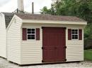 This 8x12 Saltbox features Almond vinyl siding, Burgundy shutters and Burnt Sienna architectural shi...